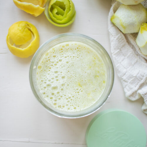 Med denne opskrift får vi et aktivt enzym rengøringsmiddel, det indeholder de vigtige enzymer som der er i konventionel rengøring, som desværre altid er fyldt med en masse kemikalier oveni (dem vil vi gerne være fri for og sjovt nok kan vi altså fermentere os frem til selvsamme enzymer på denne måde). Enzymer er vildt gode til at opløse fedt og kalk, det betyder renere tøj hvis man bruger det i vaskemaskinen og renere opvask i opvaskemaskinen. Det kan også bruges til mange andre ting og jeg skal nok dele opskrifter, hvori de aktive enzymer kan bruges til stor glæde, i fremtiden.