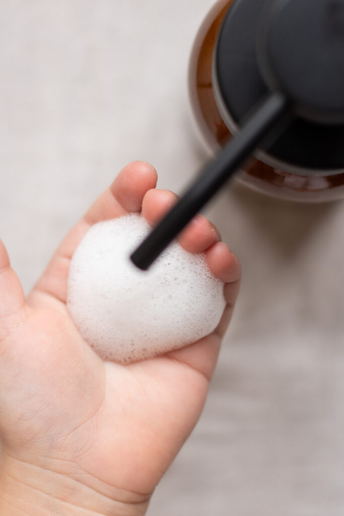- Pump sæben direkte ud på en vatrondel og afrens din hud om morgenen. Plask vand direkte på huden indtil den er fri for sæbe. Påfør Mist, Serum og Balm eller hvad du nu bruger.