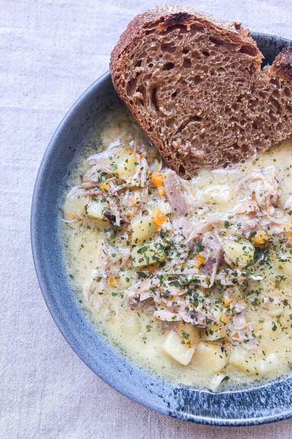 Jeg bruger ti minutter aktivt i køkkenet når jeg laver denne velouté. Den er simpelthen så nem, når man bare lige har sørget for at forberede sig, hvilket jeg ser som en dyd! Det at forberede sig er nemlig en af de største dyder, som jeg ser det. En dyd jeg desværre aldrig selv har…
