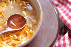 - Sæt gryden over ved høj varme til den simrer uden omrøring. Sæt da varmen ned til lav og lad det simre ved lav varme med jævnlig omrøring i ca. 45 minutter.