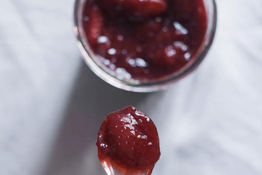 Denne marmelade er fantastisk i en Skovbær Stracciatella is, som vi også laver. Den er dog også himmelsk ovenpå yoghurt eller på et stykke surdejsbrød. Ja den er bare skøn og indeholder naturligvis hverken tilsat pektin eller lignende, blot 5 uraffinerede ingredienser, og kræver blot lidt tid og varme og så har man den smukkeste og lækreste hjemmelavede marmelade.