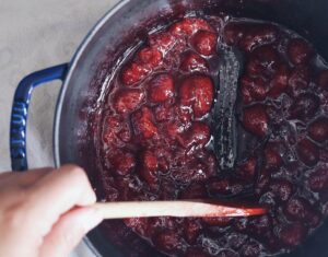 - Når bærrene har afgivet lidt saft sætter du varmen op til fuld blus. Vær opmærksom nu, du skal være over marmeladen hele tiden, så den ikke brænder på.