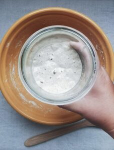 - Når din levain er fordoblet ca. 3-5 timer senere, kan du se bobler på den og nu blander du den med 25g vand og rører den tyndere.