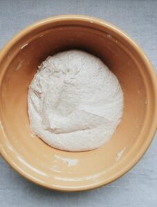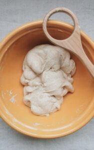 - Tilføj levain til din dej og rør den ind i dejen uden at overbearbejde dejen (jeg bruger et dansk piskeris til dette). Dæk dejen med det fugtige hør/bomuldsklæde og lad den trække yderligere 30 minutter i et rum der er ca. 24-25 grader.