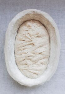 - Når dejen er færdig med at hæve ved stuetemp. Drysses en banneton/hæve kurv med rigeligt mel (jeg bruger hirse eller rismel, det fungerer simpelthen bedst og sørger for brødet slipper kurven let).