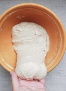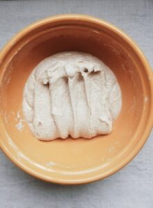 - Gentag indtil du har trukket og foldet og roteret skålen 4 gange i alt og lad så dejen hvile i 15 minutter ved ca. 24-25 grader overdækket.