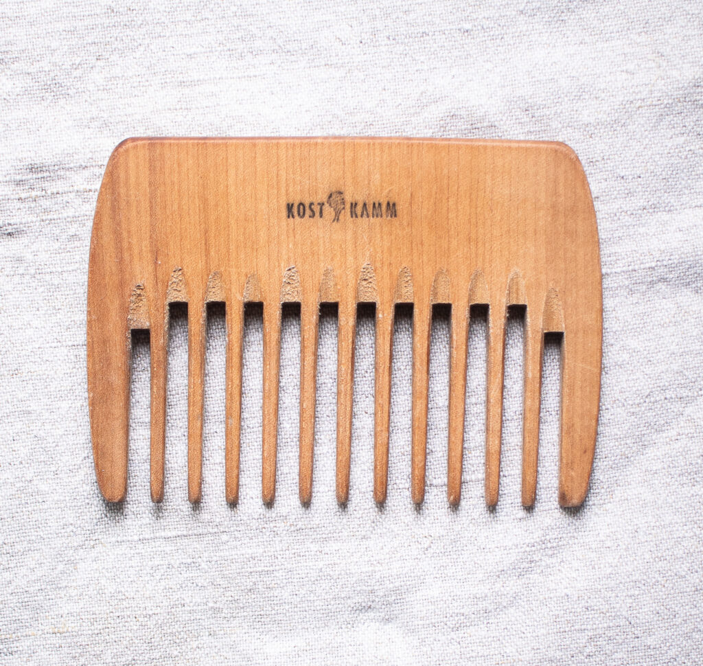 Vedligeholdelse: Rens kammen for hår og fnuller efter brug. Vask kammen en gang om ugen med castille sæbe eller en shampoo bar, sørg for der er helt ren i mellem alle tænder, brug evt. en opvaskebørste til dette. Tør den grundigt af og læg den et tørt sted hvor den ikke risikerer at falde på gulvet.