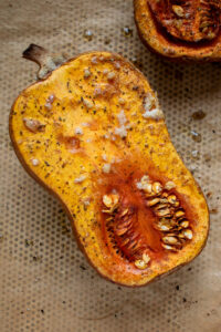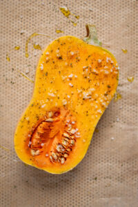 - Flæk butternut squash på midten og lig dem på en bageplade med papir. Smør med fedt/olie. Krydder med salt og peber. Bag i midten af ovnen i ca. 30-40 minutter til de er møre.