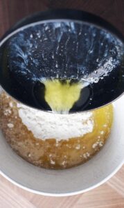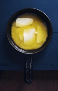 - Vej smørret af og smelt det over lav varme, imens du blander resten af dejen.
