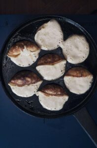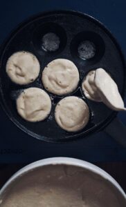 - Varm din pande (dette step er meget vigtigt), en kold pande er det værste en æbleskive ved, så varm den i 5-10 min ved mellem-høj varme inden du begynder at bage æbleskiverne.