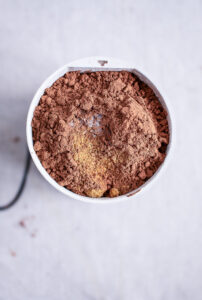 - Hæld det rå rørsukker, Fleur de Sel og 3 skefulde af kakaoen i en krydderi kværn og blitz i 30 sekunder.