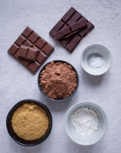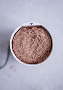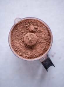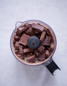 - Put alle ingredienserne og din brune kakaomelis i mini foodprocessoren og pulse indtil chokoladen er helt pulveriseret.
