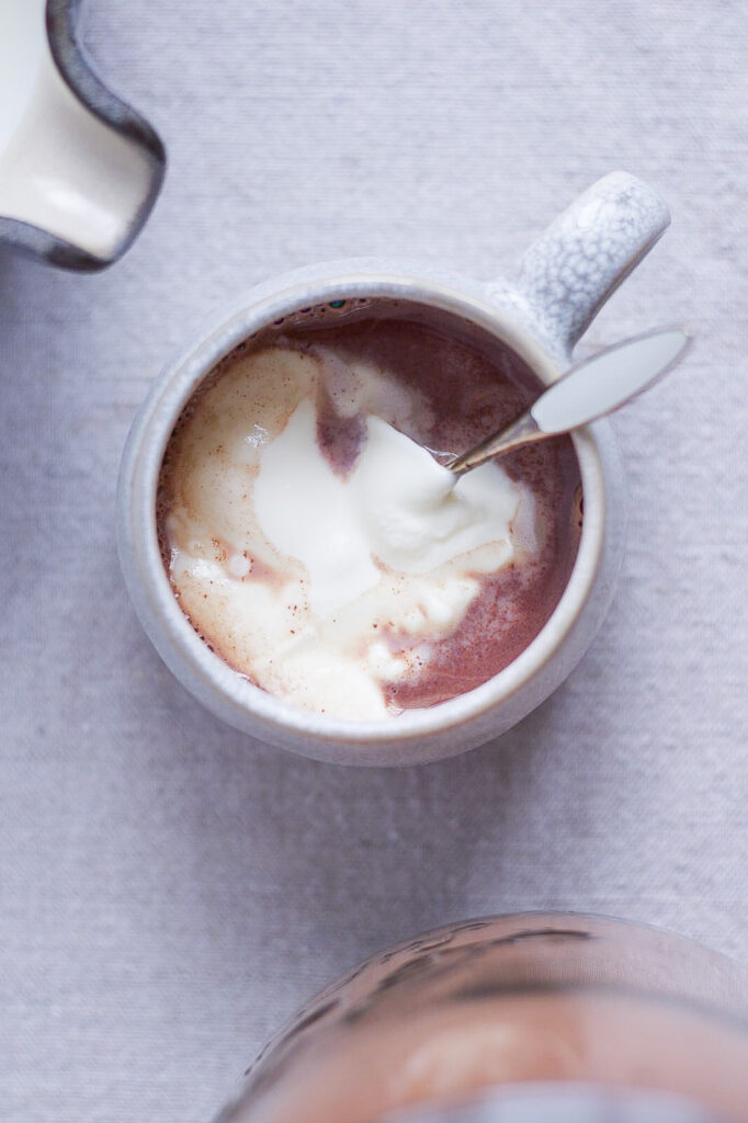 Da vi havde butikken, solgte vi det her pulver til varm chokolade, både i krus med skummet mælk og fløde. Men vi solgte det også på glas, så folk kunne få det med hjem, eller give det væk som gave…