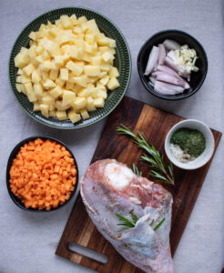 Tip: Har man ikke kalkunlår, kan denne ret laves med kyllingelår, hane eller andet fjerkræ. Du gør bare præcis det samme, bruner lårene af og lægger dem på toppen af rodfrugterne.