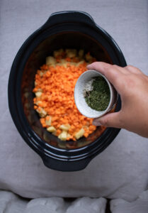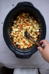 • Hæld kartoffel og gulerodsternene ned i crockpotten og tilsæt krydderierne.