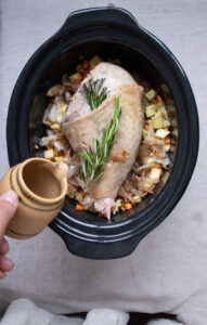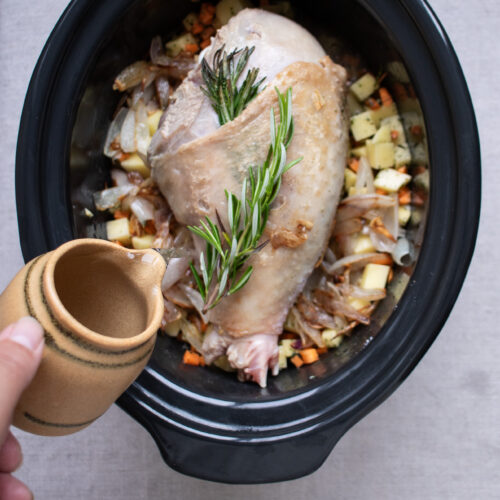 • Forbered kalkunlåret ved at gnide det med salt og peber, jeg piquerer altid med rosmarin og hvidløg under skindet på kalkunen også. Varm en pande med fedt og glaser løg og hvidløg, tag dem af panden og steg kalkun låret af, tilsæt fedtet fra panden, løg og hvidløg til retten og rør det rundt. Læg så kalkunlåret ovenpå sengen af grøntsager og hæld vandet ovenpå grøntsagerne, læg låget på crockpotten og lad det få ca. 6-7 timer på lav varme.