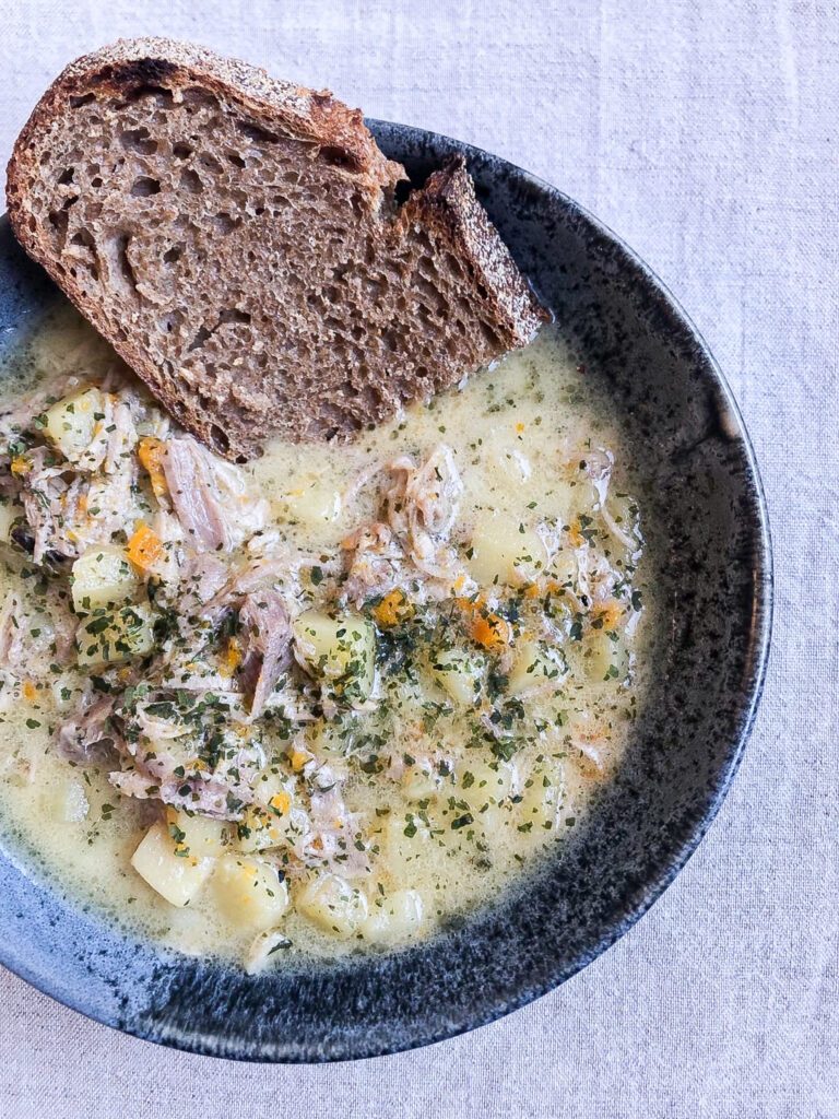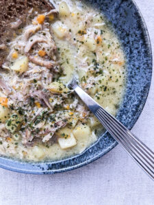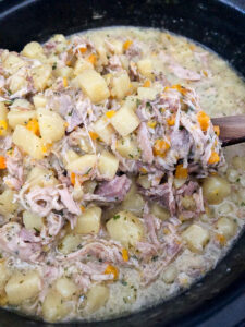 • Når der er ca. 40 minutter til at maden skal serveres, tages låret op af crockpotten (Brug en bred paletkniv til at holde under låret, da det ellers går helt fra hinanden). Fjern alle ben og skindet og smid det ud. Riv kødet i strimler og bland det ind i gryderetten sammen med piskefløden og sæt crockpotten på high i 30 minutter.