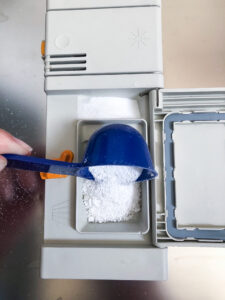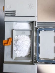 - Fyld det lille rum ved siden af sæberummet med 2 spsk citronsyre ved hver vask. Her kan du også putte din enzym rengøring i. Har du ikke dette rum (det har vi foreksempel ikke i vores lille hus), så kan du blot putte begge dele i bunden af opvaskemaskinen, jeg lægger det ude i venstre side, så det når at blive opløst inden det kommer i direkte kontakt med opvaskepulveret.
