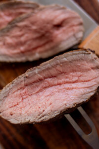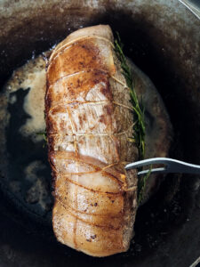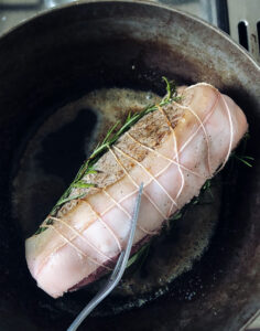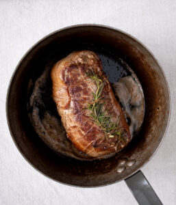 - Det tager ca. 2 minutter per side, jeg holder den altid med en stegegaffel når jeg jeg skal brune de smalle sider og enderne af stegen.