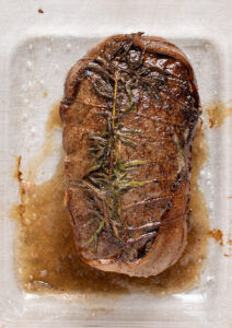- Flet rosmarinen ind under kødtråden så den sidder fast på for og bagside af stegen.