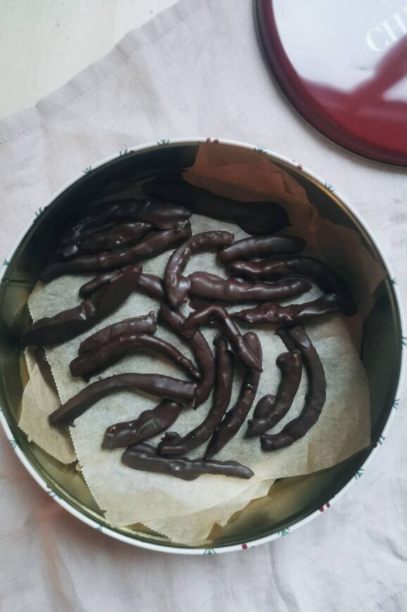 “Sådan en appelsin er vel noget af det mest frugtbare og julede der findes. Jeg ønsker, at i alle må blive velsignet med en appelsin i jeres turban denne Jul” Indtil da, må i nøjes med opskriften på mine orangettes. Det er en af min families yndlings chokolader. Jeg laver rigtigt mange af dem her…