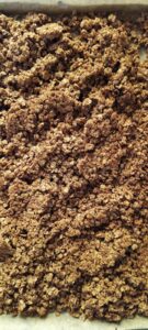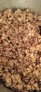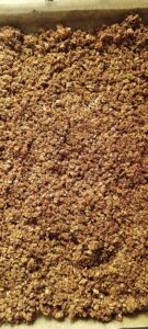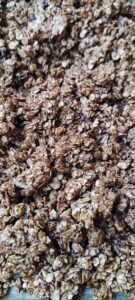 - Når granolaen har fået farve (vær opmærksom på det er sværere, at se på en chokolade granola), så vær ekstra opmærksom de sidste 8-12 min. Når den er ristet færdig duften den skønt (ikke brændt) og ser således ud. Granolaen stilles til afkøling på en rist. Indtil den er helt kold (ikke bare lun, men kold!)