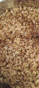 - Når smør og honning bobler (det må ikke blive mørkt eller skifte farve). Tilsæt da havreblandingen og rør det hele grundigt rundt, så alt bliver frostet med honningsmøret.