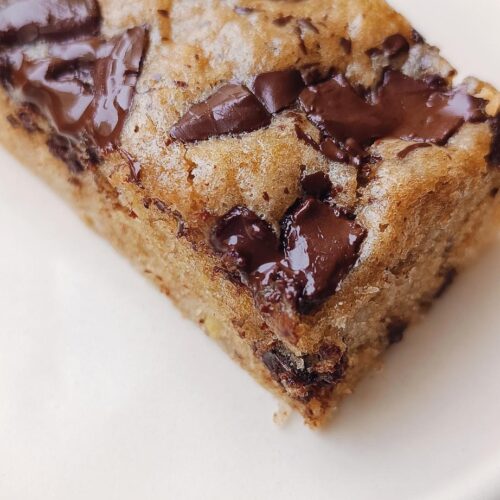 - Hæld dejen jævnt ud i formen og drys den resterende halvdel af chokoladen udover kagemassen.