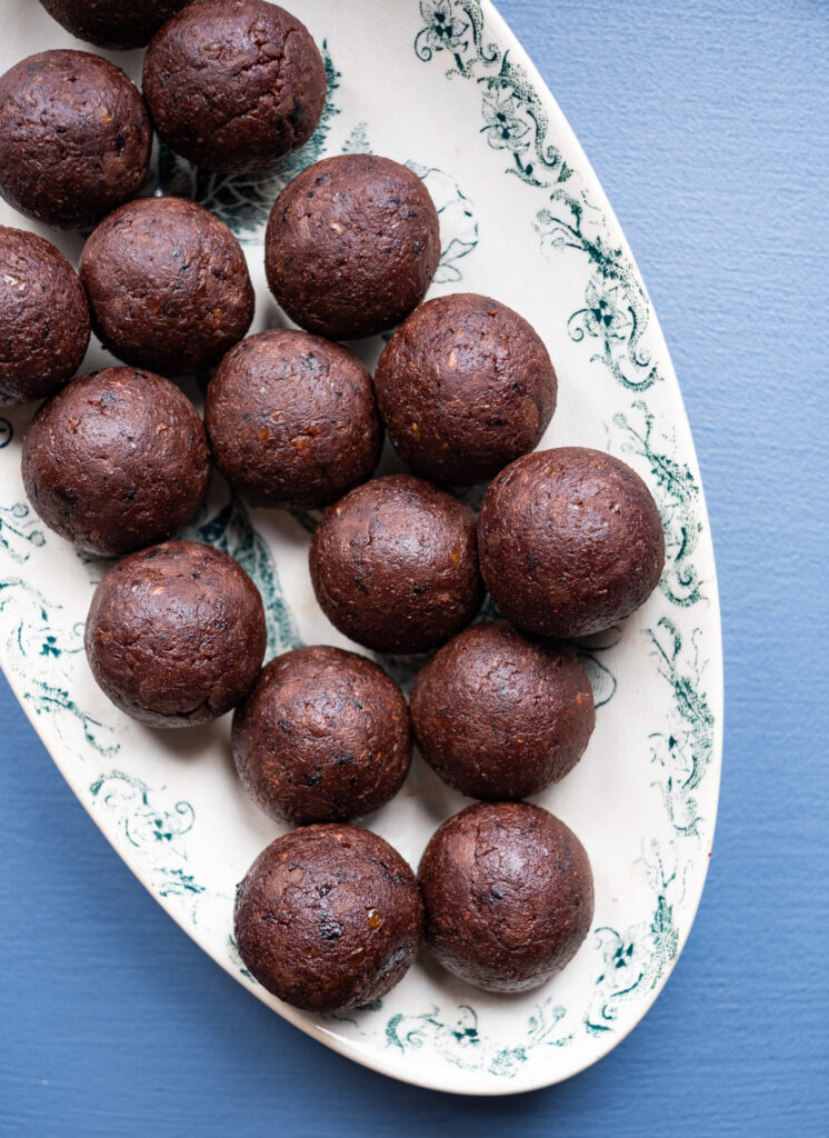 Dadelkuglerne har en dejlig smag af chokolade og blåbær “ikke som dem du køber, de er så meget bedre!”.