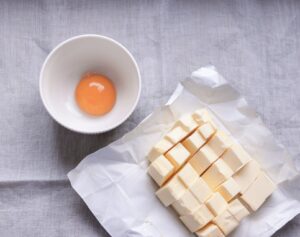 - Tag æggeblommen fra et æg og skær det kolde smør i små tern.