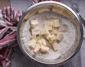 - Smørternene smuldres ind i melet (afkøl dine hænder inden du gør dette, ved at vaske dem i koldt vand, så opvarmes dejen ikke ligeså hurtigt)