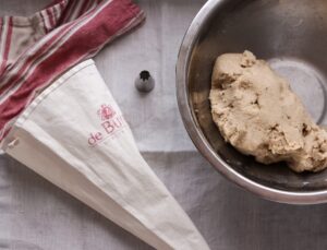 - Når dejen har trukket (eller spiret til næste dag), forvarmes ovnen til 180 grader (ikke varmluft). Dejen kan nu fyldes i en sprøjtepose (jeg plejer at dele den op i to dele, jeg foretrækker en gammeldags textil sprøjtepose, til småkager, da de holder bedre.