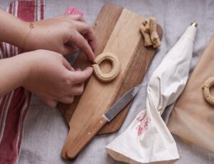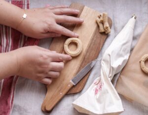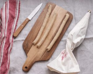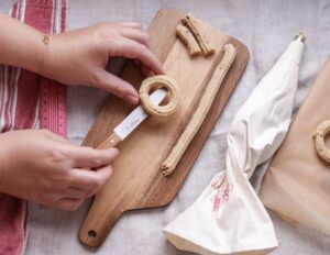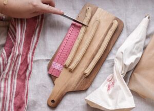 - Sprøjt lige rækker af dej ud på et skærebræt.