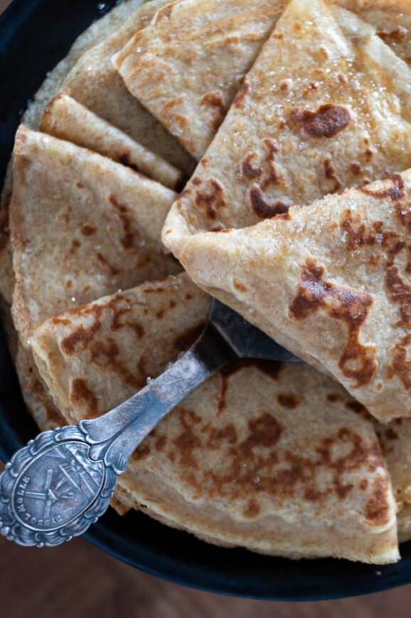 Min far bagte for det meste pandekagerne hjemme hos os. Han brugte altid en opskrift fra en vegetarisk kogebog fra 1970’erne, jeg mener det var fra en fransk forfatter og den opskrift lavede da ganske fine pandekager, såvidt jeg husker var det primært den opskrift der blev brugt fra kogebogen og de andre knap så…
